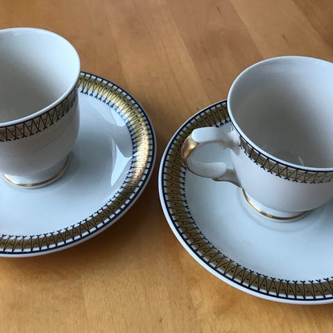 Arabia Gilda kahvikupit ja lautaset, yhteensä 12 kappaletta. Sarja sisältää kahvikupit ja lautaset, joissa on kultaisella pohjalla musta kuvio. Käsinmaalatut hienot kupit alkuperäisissä pakkauksissaan.