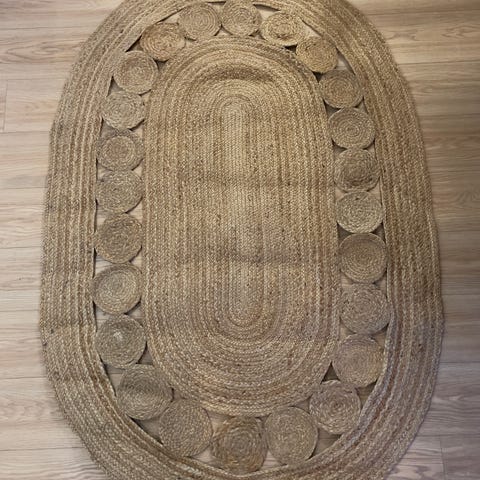 Hyväkuntoinen käsintehty iso juuttimatto.