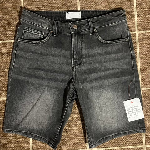 1) Bershka miesten farkkushortsit vyötärö 47 cm x 2, vyötärö lahje 53 cm ulkosaumasta, siistit käytetyt, 6 e