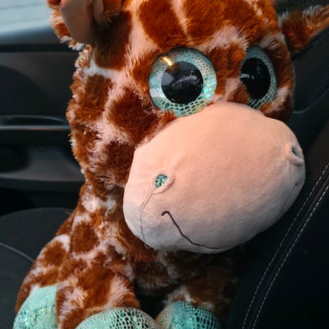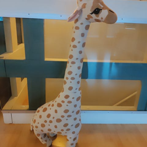 Iso kirahvi-pehmolelu, korkeus noin 97cm (mitat toisessa kuvassa). Ollut käytössä vain sisustuselementtinä huoneen nurkassa, täysin hyvässä kunnossa siis. Hinta uutena 30€, merkki H&M Home.