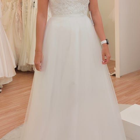Myynnissä upea ja kerran käytetty Zazabellan Dazzling Tulle -malliston häämekko! Mekossa on näyttävä kerroksellinen tyllihelma, hohtavaa pitsikirjailua ja elegantti avoselkä pitsiyksityiskohdilla.