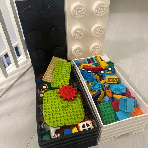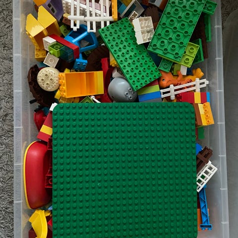 Myydään iso laatikko duploja, eläimiä ja ukkoja, perupalikoita ja ajoneuvoja.