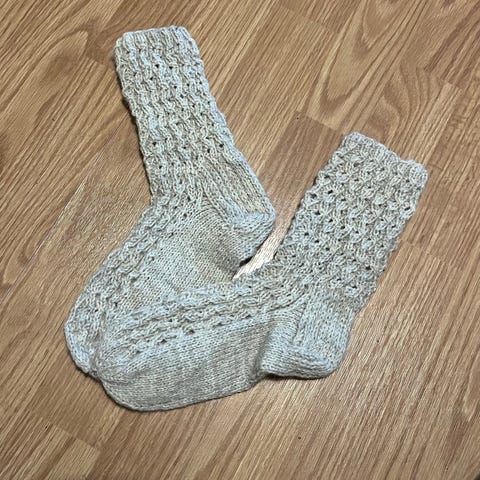 Villasukat. Mitta n 19-20cm. siniset uudet. Toisissa nyppyä, hyvät käytetyt. Koko n 30-32
