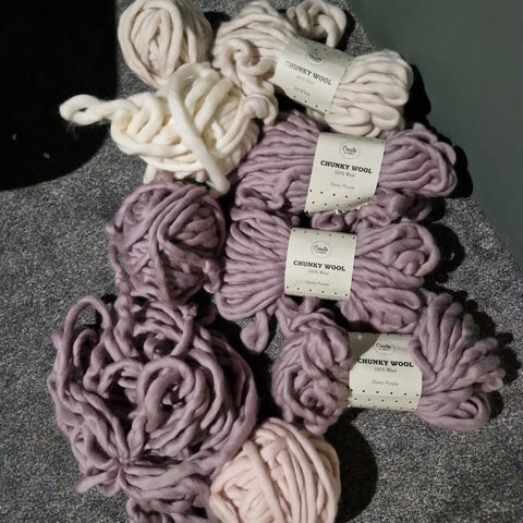 Chunky Wool Merino Villalanka on 100% villasta valmistettu paksu ja pehmeä lanka, luonnonvalkoisessa värissä. Purettu itse käsinvirkattu peitto, peiton koko oli 170 cm * 130 cm. Lanka useammassa pätkässä.