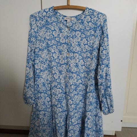 Kukkamekko, jossa röyhelö helmassa ja vyö, pitkä kullanvärinen vetoketju selässä
