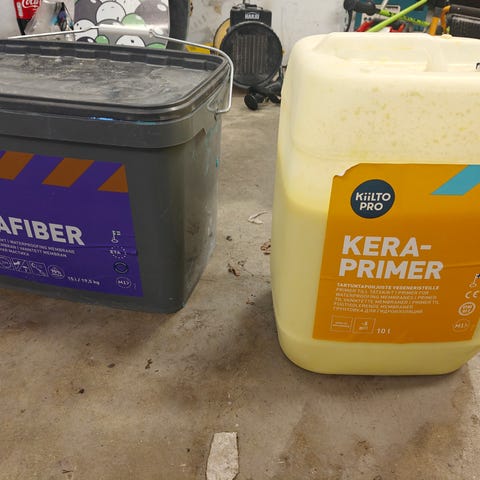 Kiillon vedeneristystarvikkeita: Keraprimer reilu 5l (avattu 10.11.), nurkkavahvikenauha 25 m avaamaton pakkaus ja 4 kpl lattiakaivovahvike settejä.