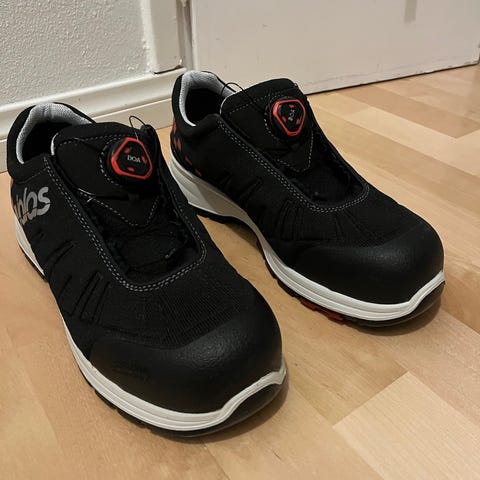 Turvakengät koko 42. Kengät ovat mustat ja punaista ja valkoista somistetta.