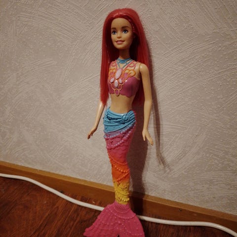 Barbie Mermaid nukke, jossa sininen ja punainen pyrstö.