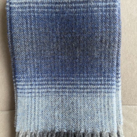 Perusväri - harmaa, siniset raidat päissä. Mitat n. 27 cm x 110 cm.