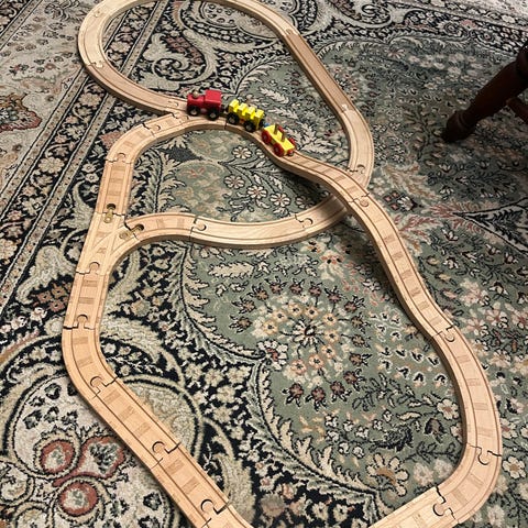 Myydään uusille leikkijöille puujunarata junineen ja vaunuineen.