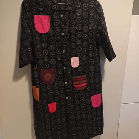 Tosi hyvässä kunnossa oleva mekko koossa 42. Väri säilynyt kirkkaana ja kangas ehjänä. Mekon helmaa on hieman lyhennetty omaan käyttöön sopivaksi (ompelujälki esillä kuvissa). Muuten mekko vastaa täysin kokotietoja.
