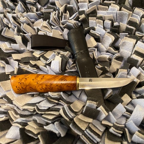 Kuvanmukainen puukko. Terä 95mm hiiliteräs. Hela messinkiä. Kahva visakoivua. Tuppi parkkinahkaa.