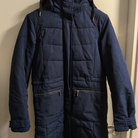 Luhta naisten talvitakki, koko S, sininen väri. Ulkovaatteessa on vetoketjullinen suljenta ja irrotettava huppu, jossa tekoturkisreunus.