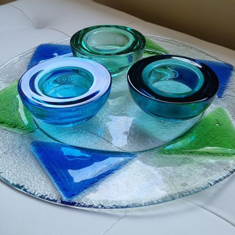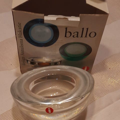 1. Iittala, Ballo tuikku astia, design Annaleena Hakatie v. 1995, siisti, vaalean sininen lasi. Korkeus 4,5 cm, halkaisija 9,4 cm. Hinta 10 e.