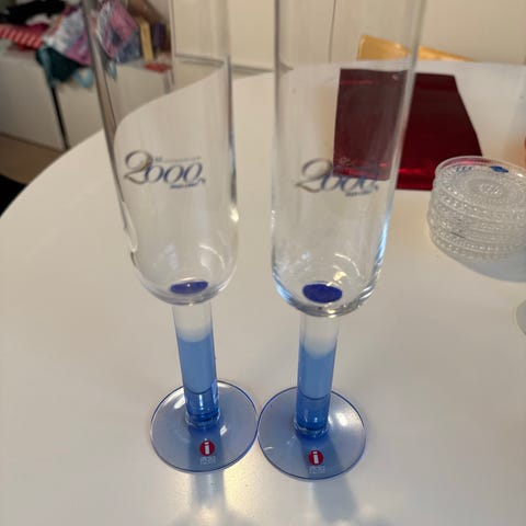 Iittala Mondo kuohuviinilasit väri Kirkas, sininen 2kpl (suunnittelija Kerttu Nurminen). Silja Line millenium 2000. Alkuperäiset laatikot mukaan.