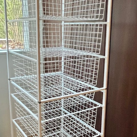 Myydään kaksi 159 cm korkeaa Elfa säilytysjärjestelmän kokonaisuutta.