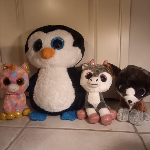 Pehmot: pöllö, panda, pilkkukoira?, kirahvi, norsu, koira à 2 e > kaikki 6 kpl 10 e