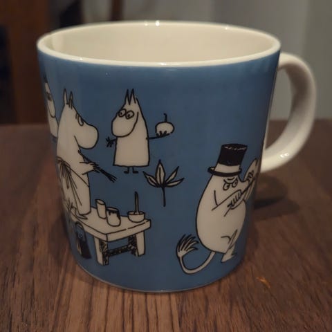 Arabia Muumi muki, vihreä. Tämänkin vanha. Pieni viiva joka ei ole halkeama ja näkyy kuvassa. Tarjoa.