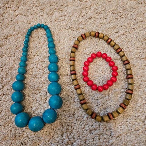 Kauniita puuhelmi kaulakoruja, vähän eri mittaisia