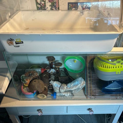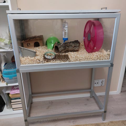 Lasinen terraario jyrsijälle tai matelijalle. Koko pit75 x lev35 x kor40. Ollut vuosia tyhjillään, siinä on aikoinaan asustanut pari gerbiiliä ja myöhemmin kääpiö hamsteri. Hollolassa tuonti Lahteen ja Keski-Suomeen mahdollista.