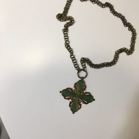 Kuvan mukainen, hyväkuntoinen. Risti 5 x 5,5 cm. Pronssia. Nouto tai posti (3.80).
