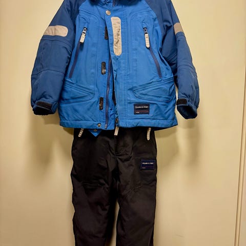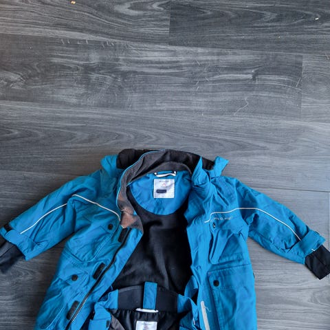 Polarn O. Pyret talvitakki- ja housut, koko 98, sininen. Setti sisältää toppatakin ja toppahousut.