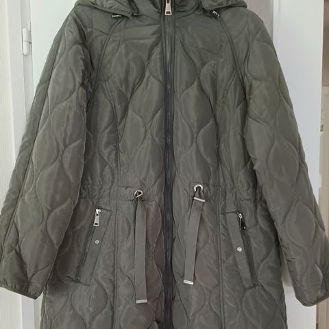 Tämä ei ole kevyt toppatakki, mutta ei kovin paksukaan.Mukava päällä.Huppu on irrotettavissa ,vyötäröllä rypytysnauha. Kainalosta-kainaloon mitta on 62,5 cm.