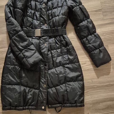 Toppatakki, jossa korkea lämmin kaulus. Reikä helmassa. Kuvista löytyy. Ei näy kun kiinni. Huomioitu hinnassa.