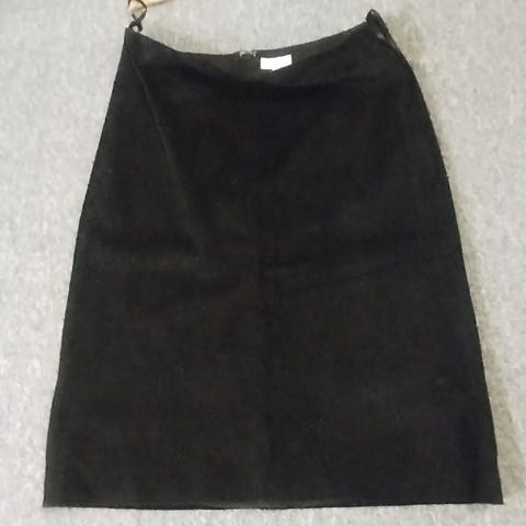Pehmeä mokkanajkainen hame, kellottuva helma. Vyötärön ympärys n 76 cm, pituus 85 cm.