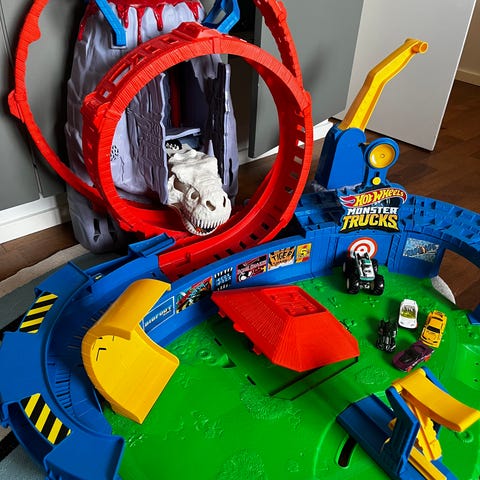 Hot wheels monster truck autorata. Äänet ja kaikki toimii. Dinosauruksen suu ei ainoastaan pysy auki.
