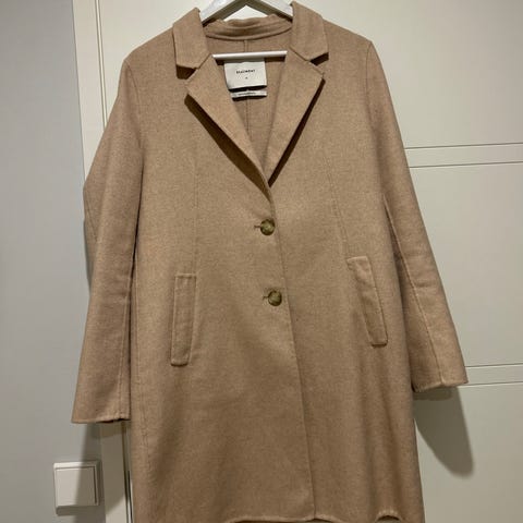Puhdas, juuri pesty buklee-villakangas takki. Hajuton takki. Klassinen ja ajaton suora malli. Hartiasta helmaan pit. 86cm, kai-kai 54cm. Pitkät hihat. Koko 40/42. Voin postittaa takin.
