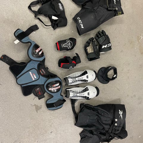 Bauer ja CCM jääkiekko varustesetti sisältäen kypärän, hartiasuojan, hanskat, housut ja luistimet. Sopii jääkiekon harrastamiseen ja harjoitteluun. Voit ostaa yksitellen tai koko setin kerralla. Olleet käytössä noin 7-9-vuotiaalla, 120-130 cm pituisella.