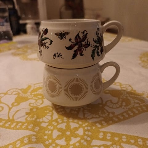 Uudenveroisessa kunnossa oleva Freija kahvikuppi ja asetti. Kupin malli FN, suunnittelija / design Göran Bäck.