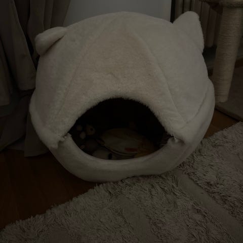 Pehmustettu pyöreä kissanpeti, jossa vaaleanbeige ulkoreuna ja pehmeä, karvainen sisätyyny. Sopii pienille ja keskikokoisille kissoille mukavaan lepoon.