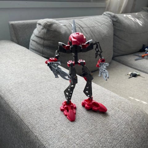 LEGO Bionicle Rakki hahmo, sininen ja musta väritys, valmistettu muovista. Hahmolla on liikkuvat nivelet ja se on varustettu keihäällä. Sopii kokoelmiin ja leikkeihin.