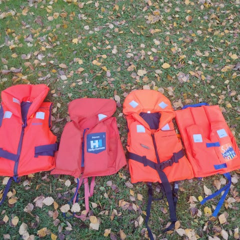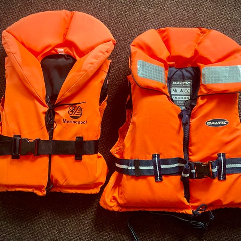 Pelastusliivit oranssina, suunniteltu lapsille. Toisesta puuttuu pilli. Myydään ensisijaisesti yhdessä 15e tai 10e/kpl.