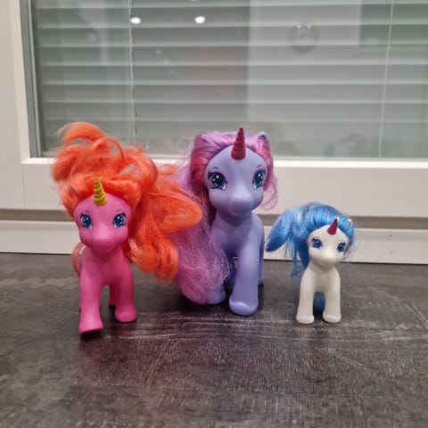 Kaksi merenneito ponia. Ja settiin kuuluvat pöytä, tarjoiluvaunut ja ruoat. Ei käytön jälkiä. Myydään yhdessä. Ovat pieniä.