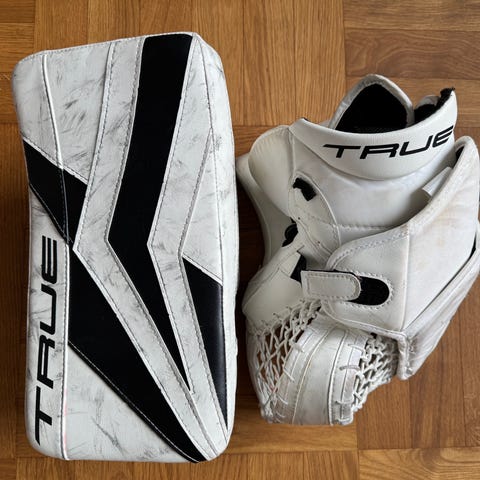 Max Väyrysen käyttämät Truen custom varusteet. Räpylä 590, kilpi 595 ja patjat 34+1, viimeisessä kuvassa muut speksit. Meillä oli käytössä alle puoli kautta, Väyrysen käytössä olleet mahdollisesti kauden verran, tästä ei tarkkaa tietoa. Kilvessä yksi reikä sormessa ja muovinen pintalevy vähän kuprulla (en ole itse huomannut mitään vaikutusta torjumiseen). Räpylän kulmassa pieni vekki ja toisen patjan knee rollsissa myös pieni vekki, näistä kuvat. Muuten peruskulumaa.