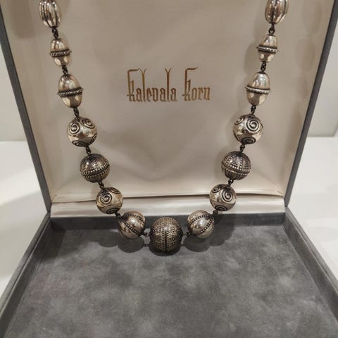 Kalevala Halikon kääty-kaulakoru. 70cm, valmistettu hopeasta. Kaulakorusta saa myös rannekorun. Mukana alkuperäinen Kalevala-korukotelo.