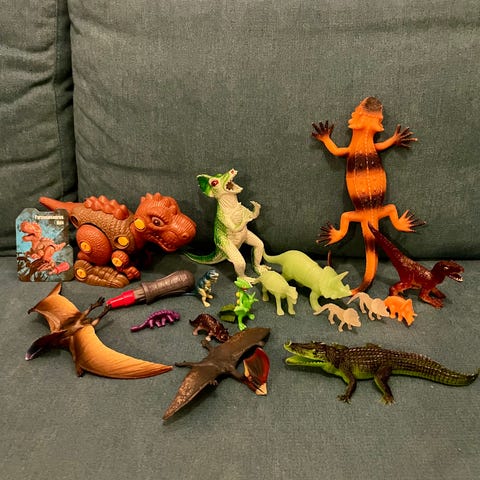 Dinosauruksia ja lohikäärme. Osa ääntelee pattereilla ja raajat liikkuu. Osa myös kävelee. Kaikki todella hyvässä kunnossa olevia ja siistejä. Toimivat. Tarjoa!