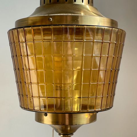 Messinki- ja alabasterijalka. Korkeus 30,5 cm ilman varjostinta ja varjon kanssa 36 cm, varjon leveys 20 cm. Messinkijalka 8x8 cm. Valaisimessa on katkaisija.