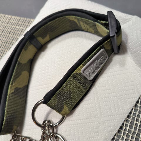 Solmudesignin tekemä puolikiristävä musta-valkoinen panta, jossa heijastavat nauhaa sekä koristehelmiä. Materiaali kestävää paracordia.