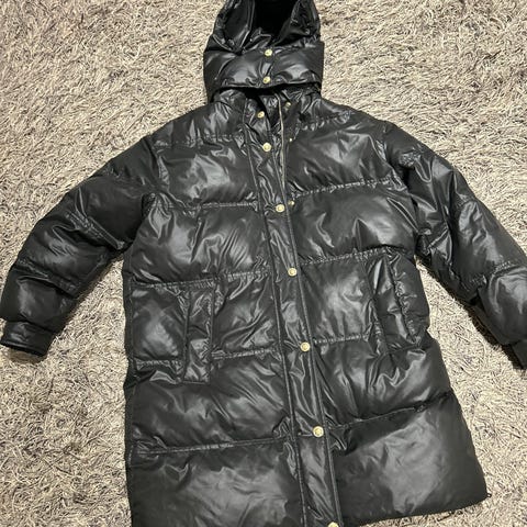 Massimo Dutti Talvitakki, väri hohtavan harmaa-hopeinen, koko L. toppatakki, vetoketjullinen &napillinen etuosa ja irrotettava huppu.