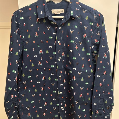Myydään poikien pohjaväriltään tummansininen joulukuvioinen kauluspaita kokoa 170. Kankaan kuosissa on pieniä joulupukkeja ja muita hauskoja jouluaiheisia kuvia. Merkki KappAhl. Kunto hyvä, vähän käytetty. Ehkä hieman pienehkö mitoitus.