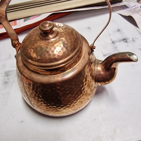 Kuparipannu Opa peltitehdas Helsinki lukee kahvassa. Vetoisuus 2 l. Pannussa hellanrengas. Pannussa ulkopuolella ja sisäpuolella käytönjälkiä.