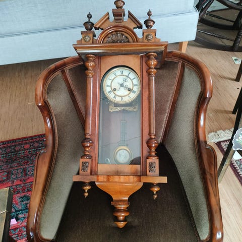Toimiva, kaunissointinen vedettävä seinäkello. Kello edistää jonkin verran, mutta säätämällä saa varmasti korjattua.