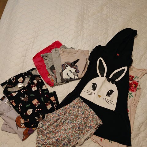 T-paita ja pitkähihaisia paitoja n.55 kpl. 7 mekkoa, 5 yöpaitaa ja n.20 kpl housuja. Kokoluokka pääosin 122/128. Jokunen kokoluokalta isompia ja yksittäisi pienempää kokoa.