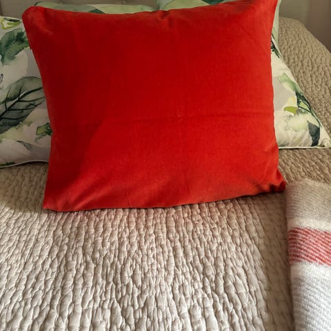 UUSI ja nätti punaharmaa päällinen tupsuilla. Koko 30x50. Hinta 6 euroa