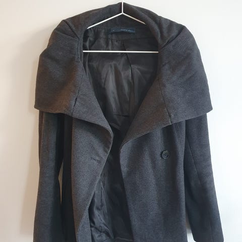 Hyvä/tyydyttävä kuntoinen musta villakangastakki. Tyydyttävä siitä syystä, että vuorisilkissä oli pieni reikä (tullut housujen vyöstä), joka on ommeltu. Takki on todella naisellinen ja tyköistuva. Sopii 36/38 kokoisille.