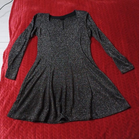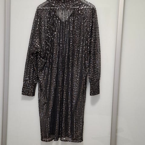 Musta ”bling bling” mekko, koko 36. Pitkät hihat, syvä kaula-aukko, alushame, vetoketju takana, tulppaanihelma.